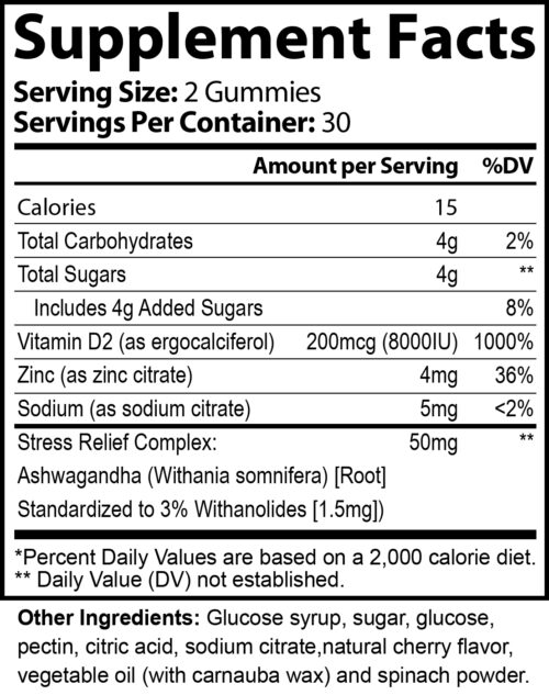 • 150 mg ashwagandha extract (Withania somnifera) per 2-gummy serving to support stress and anxiety relief, healthy cortisol balance, and mood.