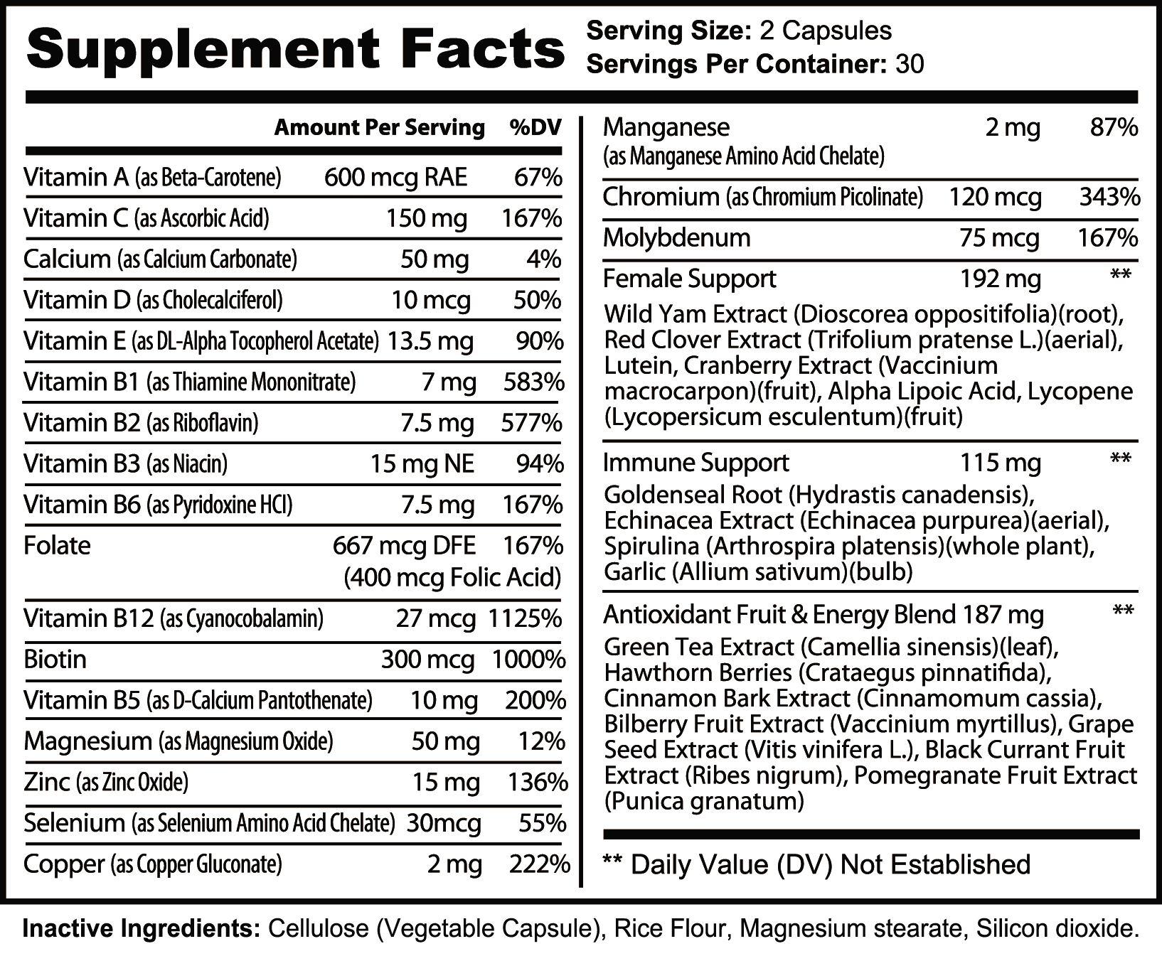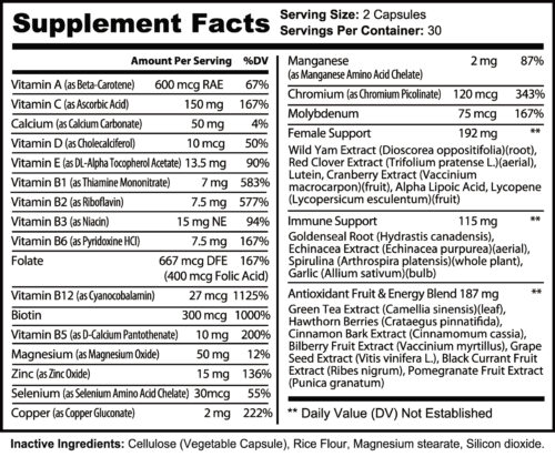 - Female support blend (192 mg) with wild yam extract, red clover extract, lutein, cranberry extract, alpha lipoic acid, and lycopene provides targeted support for women’s hormone balance, urinary tract health, antioxidant protection, and everyday wellness.